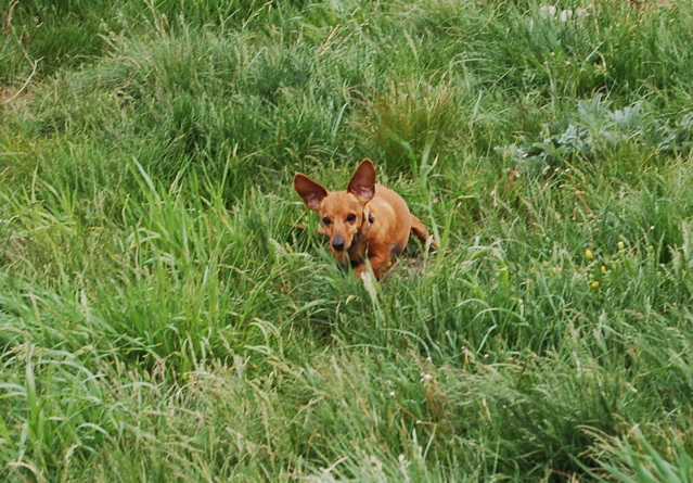 This is how our new arrival, blind Madison, often greets us at the gate to Widget's House — literally jumping for joy. You'd think for a little old lady this would be a bit too much activity, but she will jump over and over again until we come through the gate. It may be hard to tell from the photo, but she is probably nearly a foot off the ground with her back feet. Madison is one very happy, very sweet girl who gets along great with everyone.